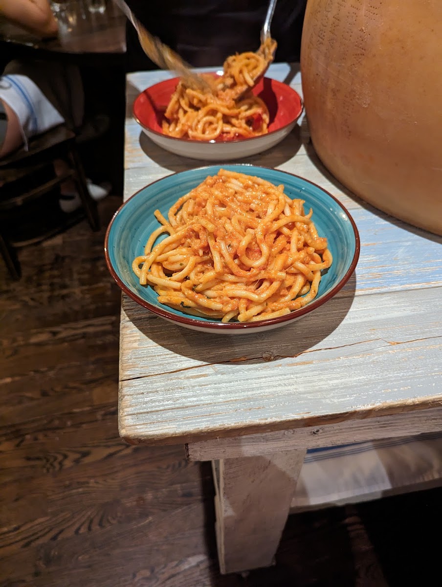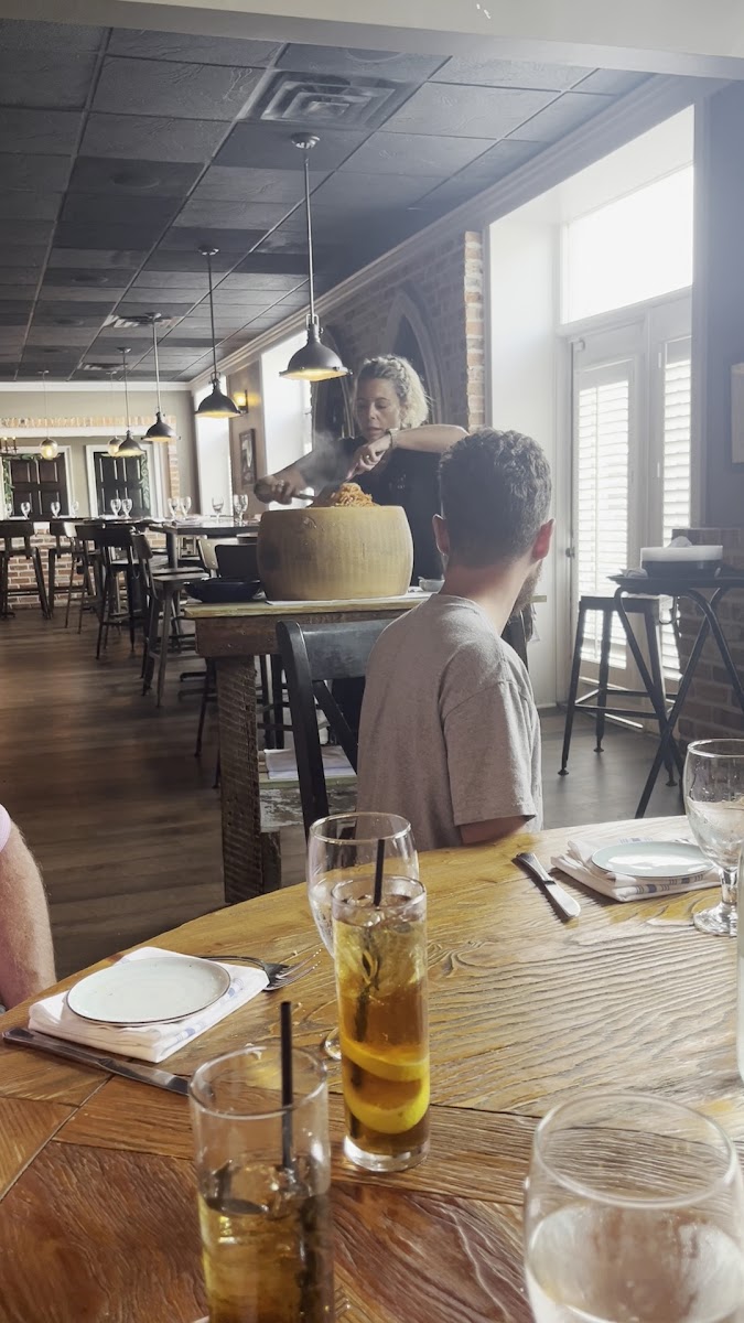 The bruschetta bread was stale and had no flavor, zero basil and instead used parsley. Our reservation had a 20-minute wait despite being told otherwise. I noted my friend’s birthday on the reservation, but there was no acknowledgment. The pasta was just okay—lacking salt and flavor—added with the cheese wheel experience was underwhelming. The limoncello was served at room temperature instead of chilled. Salads were decent, but overall, for the price and lack of flavor, I’d give this place a low four stars. Not somewhere I’d visit regularly, hoping for improvement before a second visit.